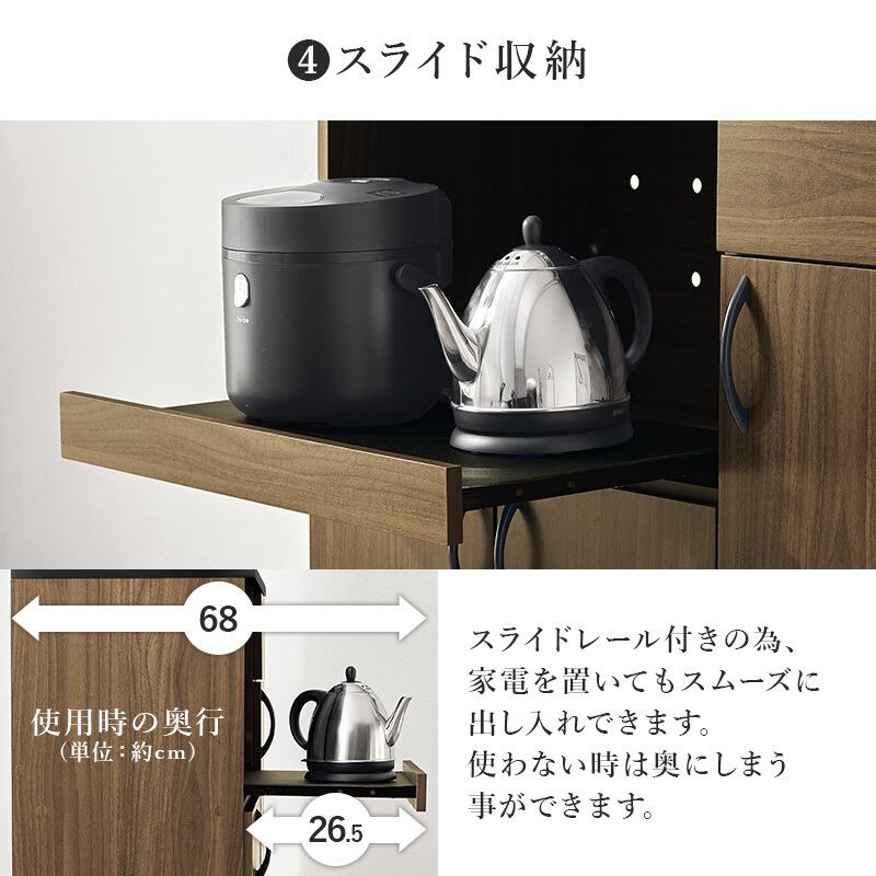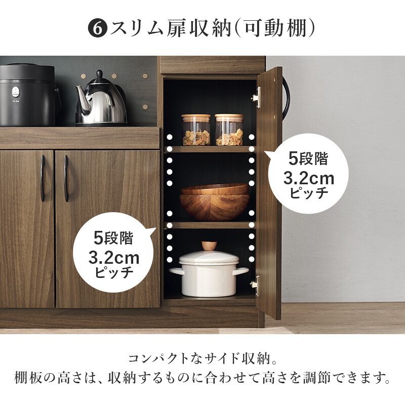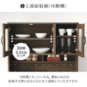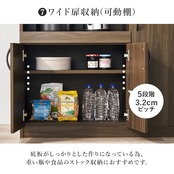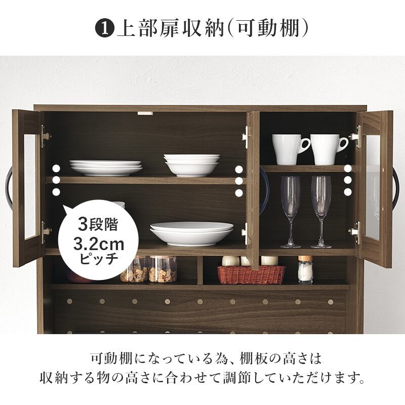 食器やキッチン家電、食品ストックまでたっぷり収納できるハイタイプのキッチンボード。扉部分には可動棚がついており、収納するものに合わせて高さが変えられます。