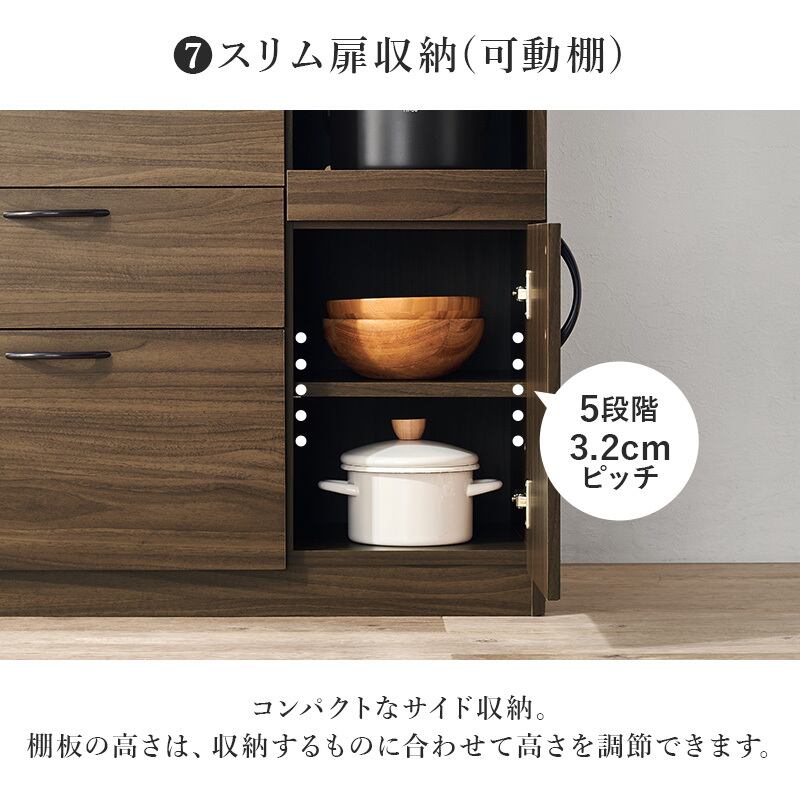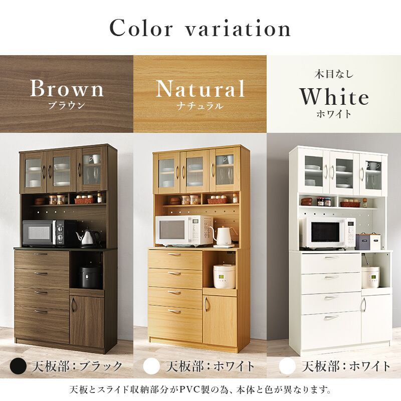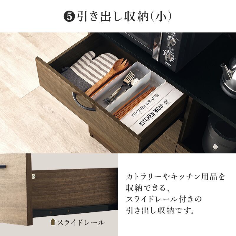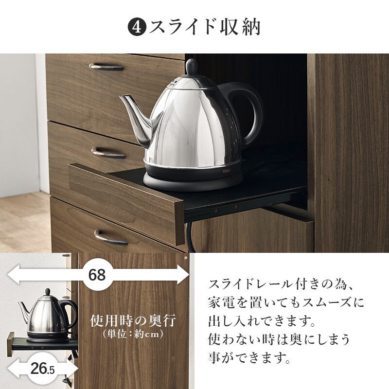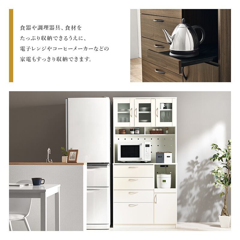 食器やキッチン家電、食品ストックまでたっぷり収納できるハイタイプのキッチンボード。引出しにはスライドレールがついているので引き出しやすく奥のものもすぐに取り出せます。