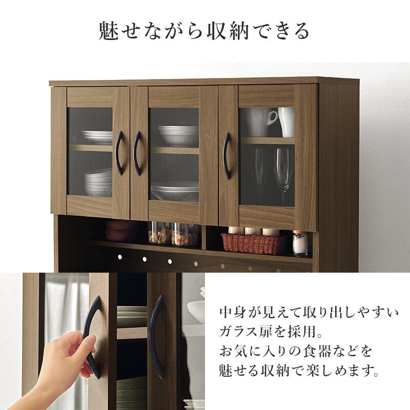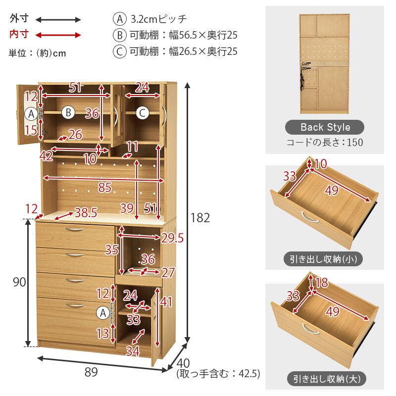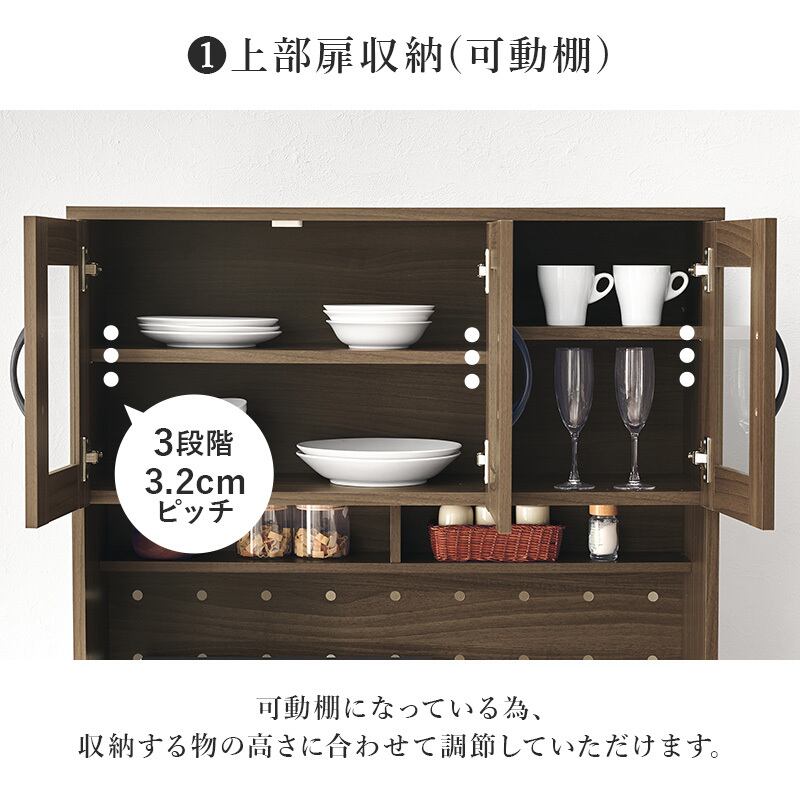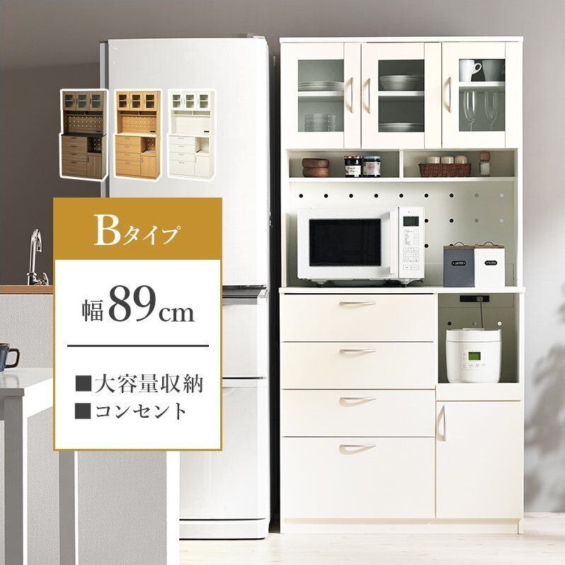 【3月下旬販売開始】キッチン収納 Bタイプ RCC-1422 幅89cm 食器棚 キッチンボード レンジ台 ハイタイプ 家電収納 可動棚 2口コンセント付き 2ヶ所 転倒防止ひも付き