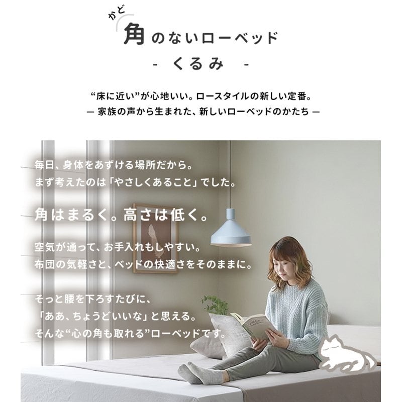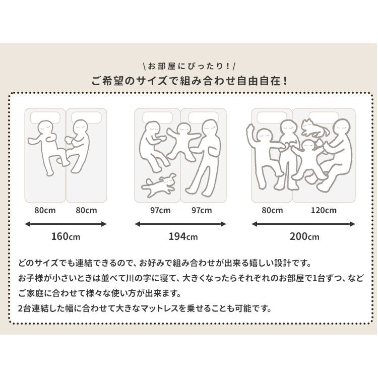 角のない安心設計と、床に近いロースタイル。 “川の字”で眠れる、やさしさを大切にした連結ベッドです。