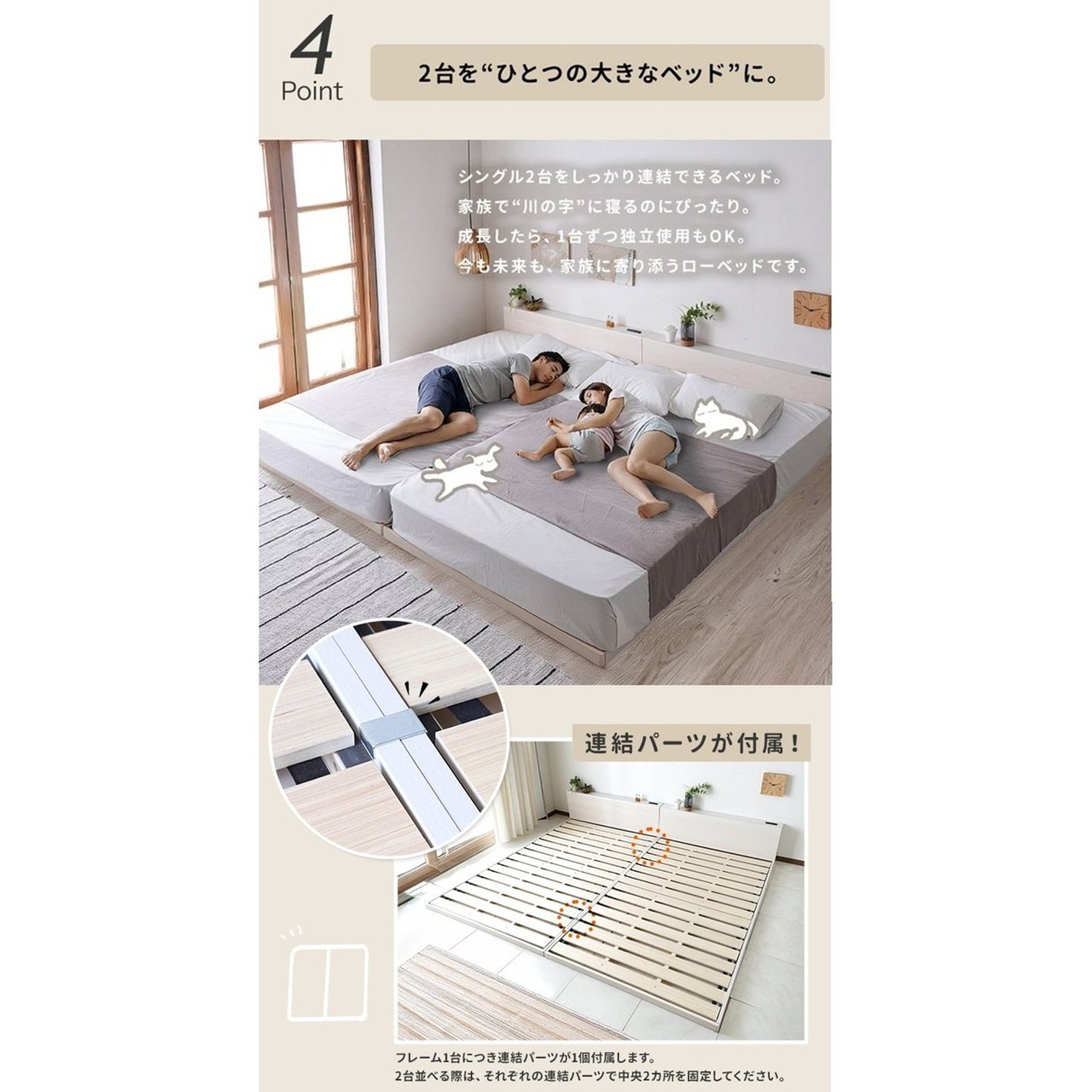 角のない安心設計と、床に近いロースタイル。 “川の字”で眠れる、やさしさを大切にした連結ベッドです。