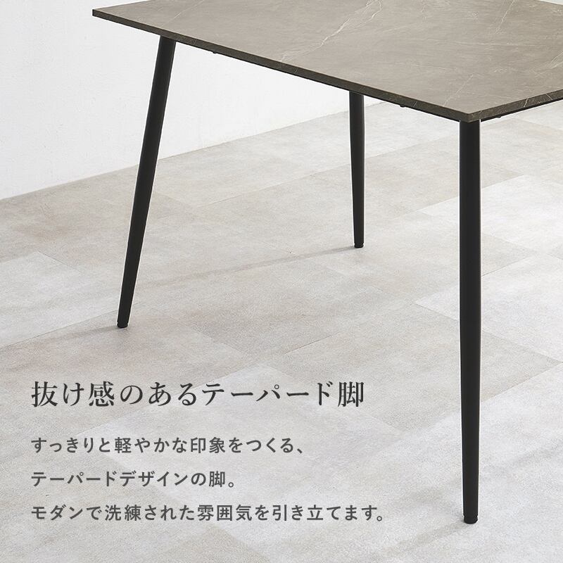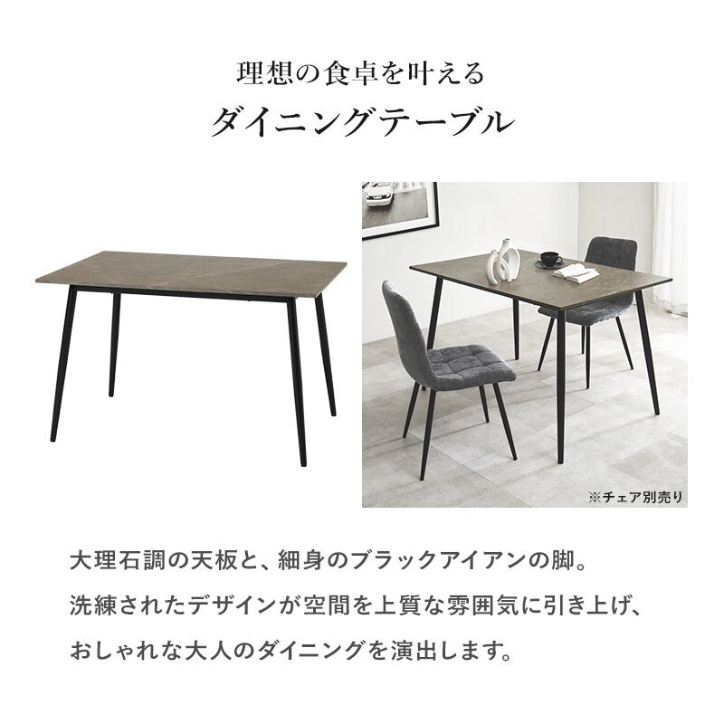 モダンインテリアに映えるグレーの大理石調の天板と細身のブラックアイアンの脚がおしゃれな大人のダイニングを演出します。