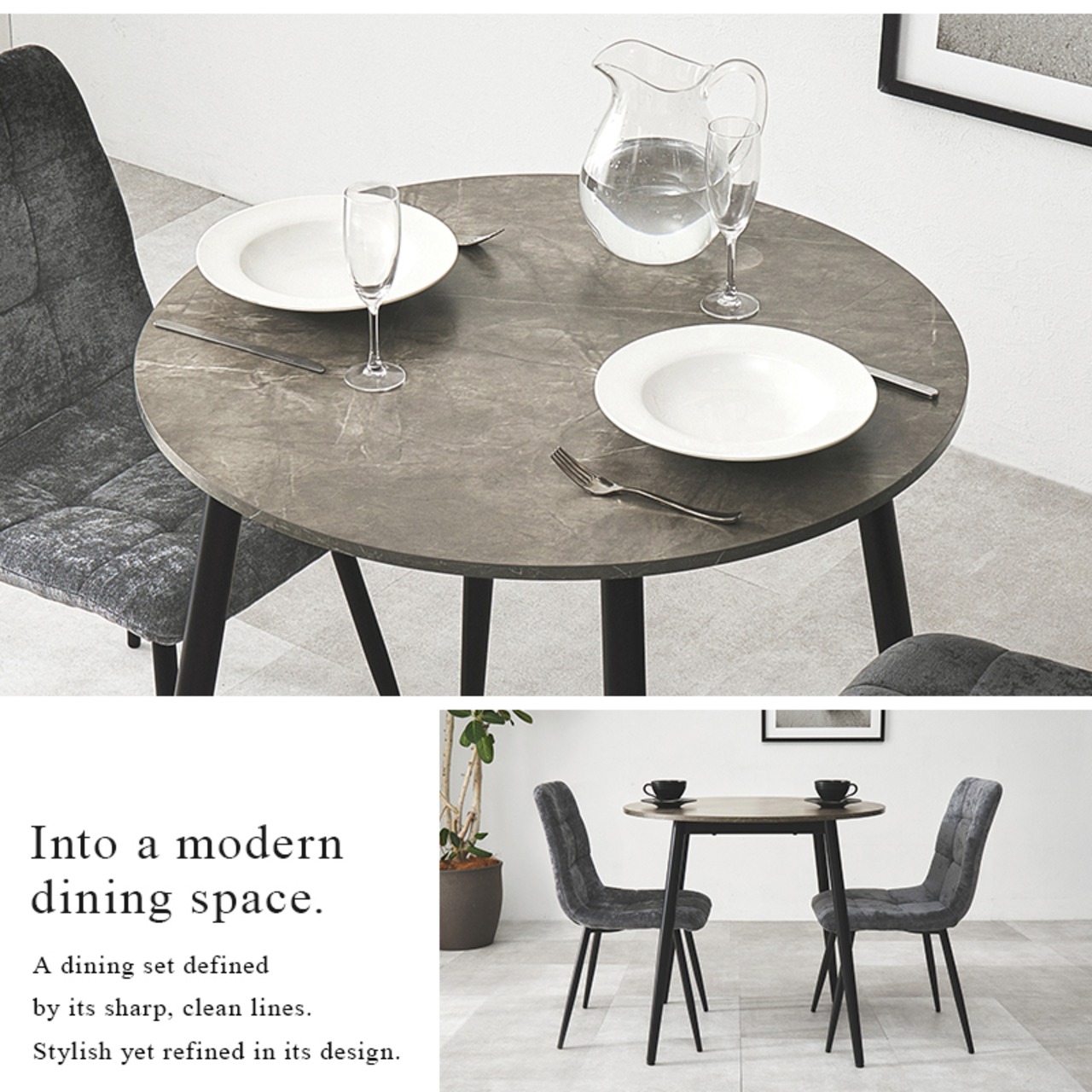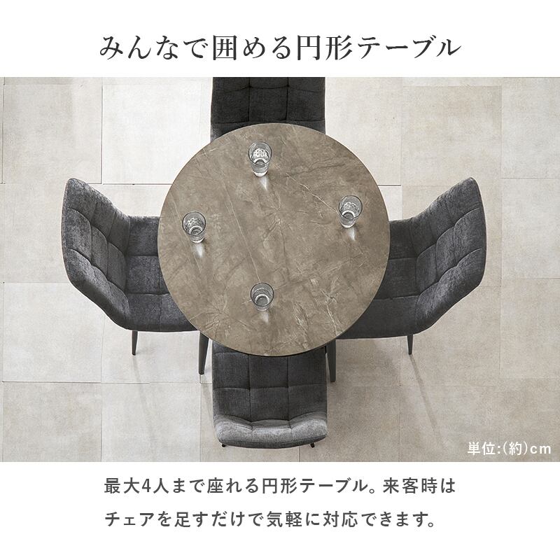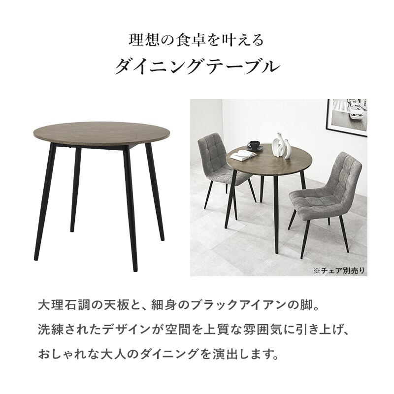 モダンインテリアに映えるグレーの大理石調の天板と細身のブラックアイアンの脚がおしゃれな大人のダイニングを演出します。