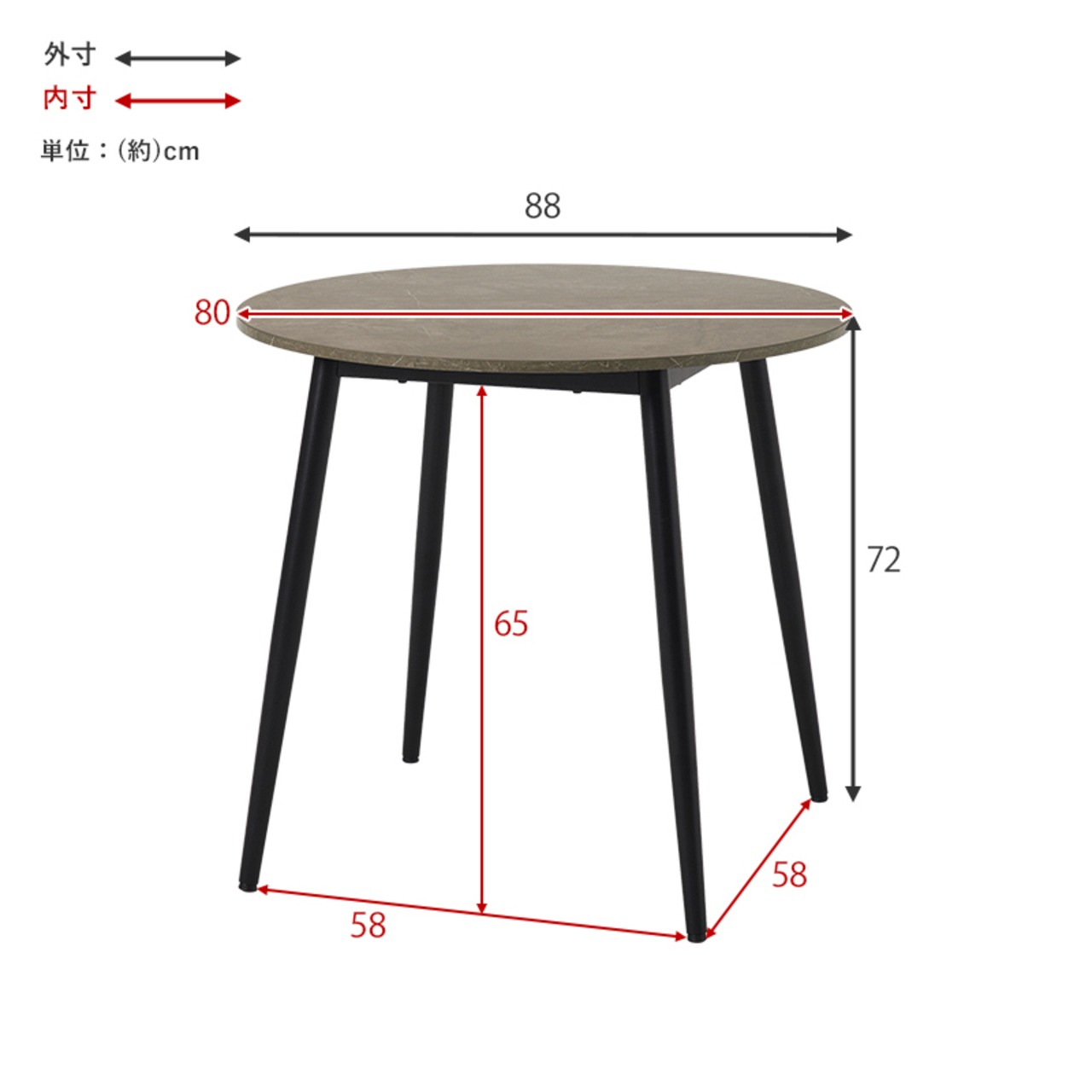 (約)幅88×奥行88×高さ72cm、天板直径:(約)80cm