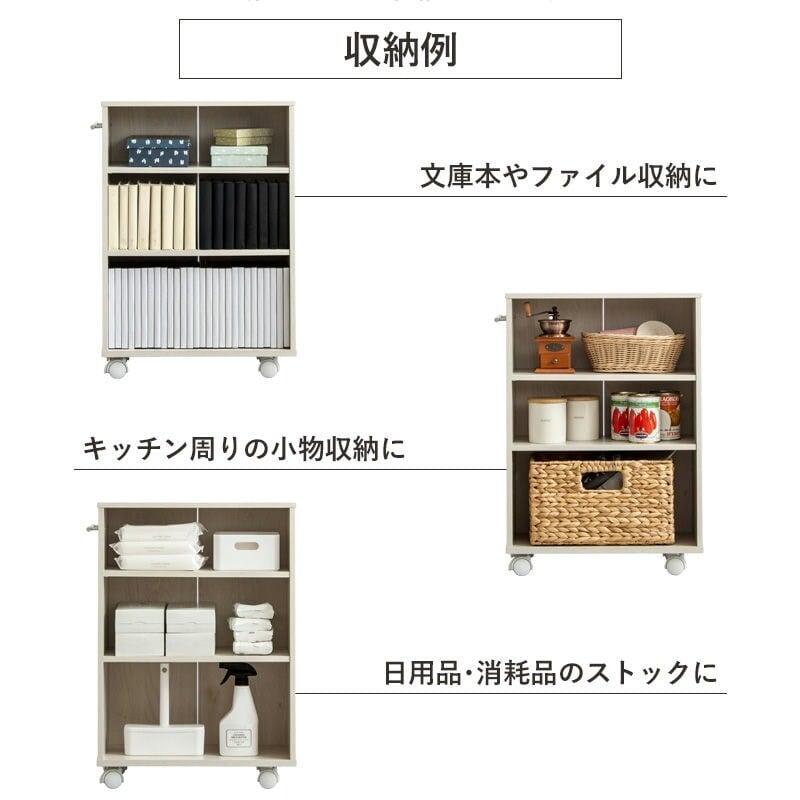 押入れやクローゼットの他、テーブルの下や家具のすき間などにぴったりな収納ラック。キャスター付きなので、小物を収納したままでもスムーズに引き出せます。幅は3サイズ(19cm/25cm/38cm)から選べ、雑誌や日用品、掃除グッズなどをきれいに整理可能。全段移動棚だから、収納物に合わせて高さを調整でき、使い勝手も抜群です。カラーはどんなインテリアにも自然に溶け込む、木目調のライトナチュラル。リビングや寝室はもちろん、キッチン・ランドリー・トイレなど、家の中どこでも活躍する多用途収納です。