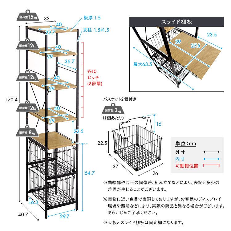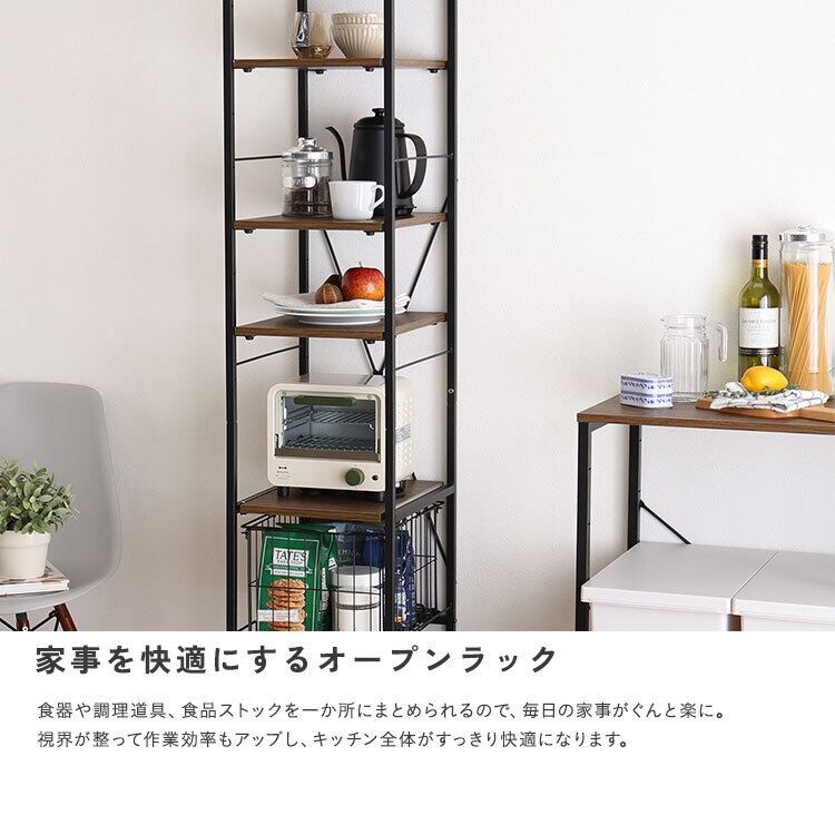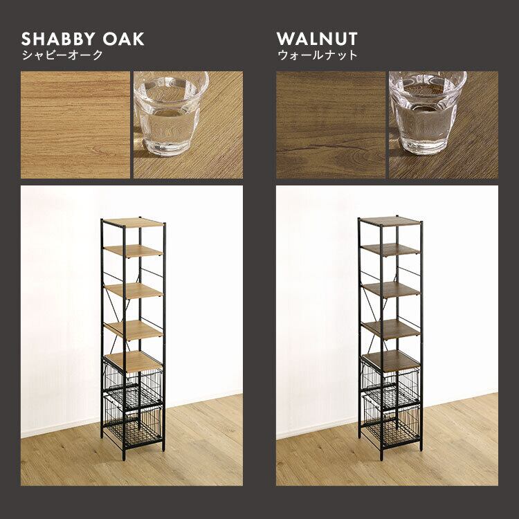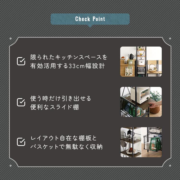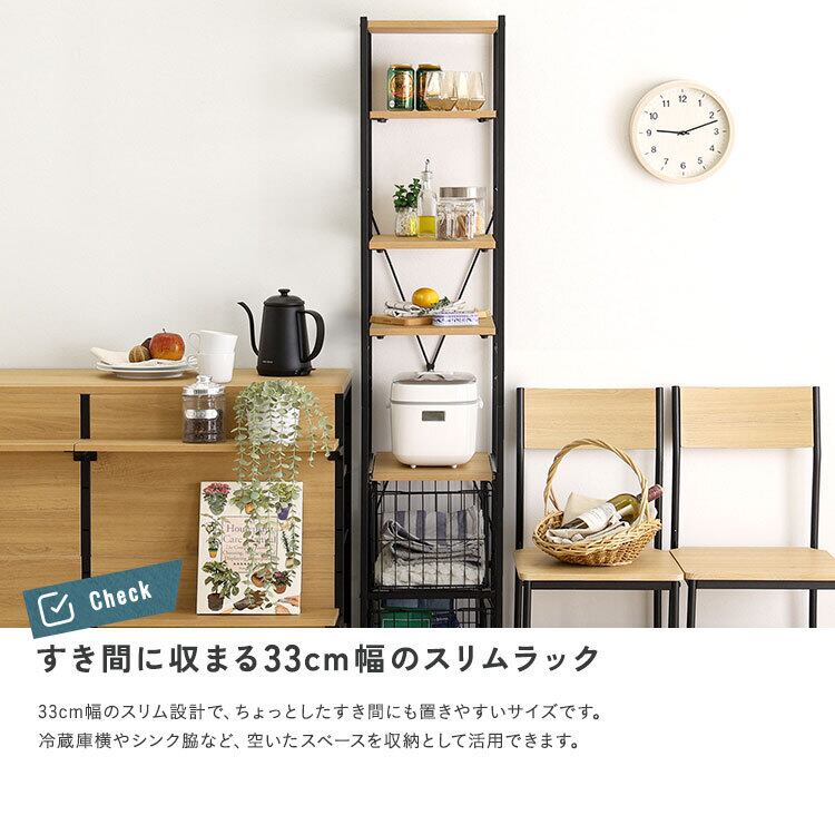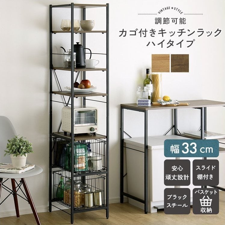 ヴィンテージ調 調節可能カゴ付きキッチンラック ハイタイプ VRZ-H 幅33cm キッチン収納ラック スライド棚付き バスケット収納 頑丈設計 PVC アジャスター付き