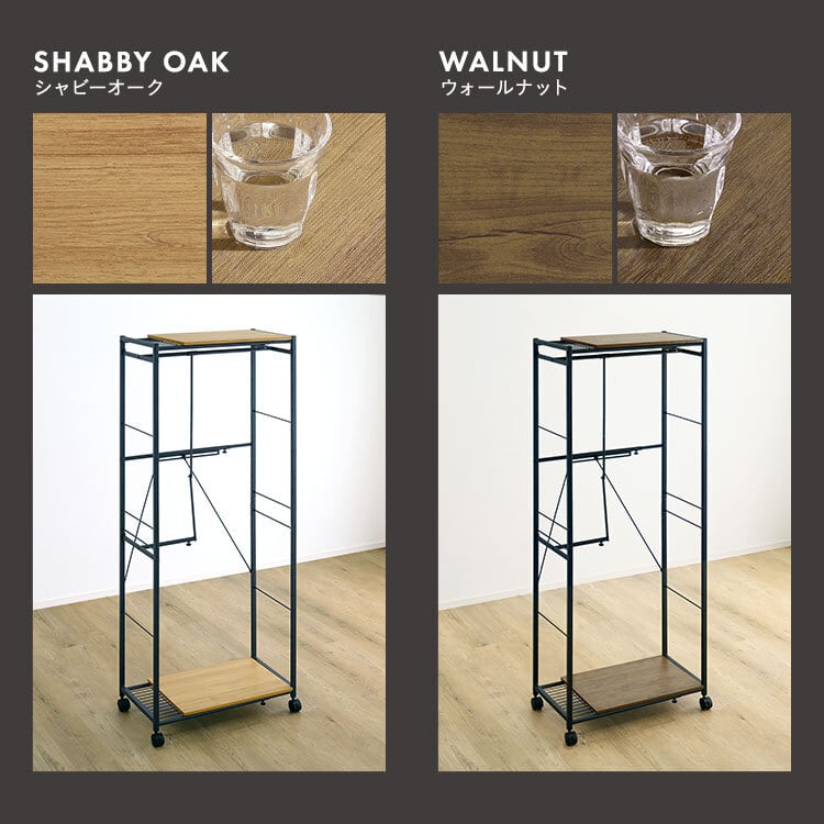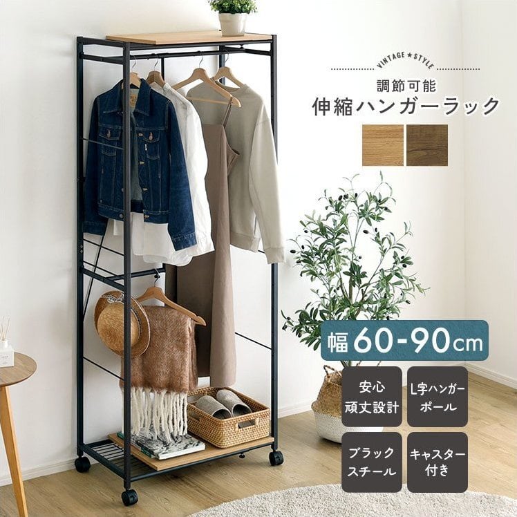 ヴィンテージ調 調節可能伸縮ハンガーラック VEXZ-690 幅60~90cm 幅調整可能 L字ハンガーポール 頑丈設計 棚板付き キャスター付き