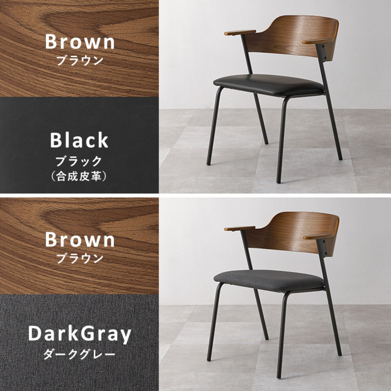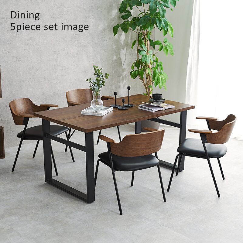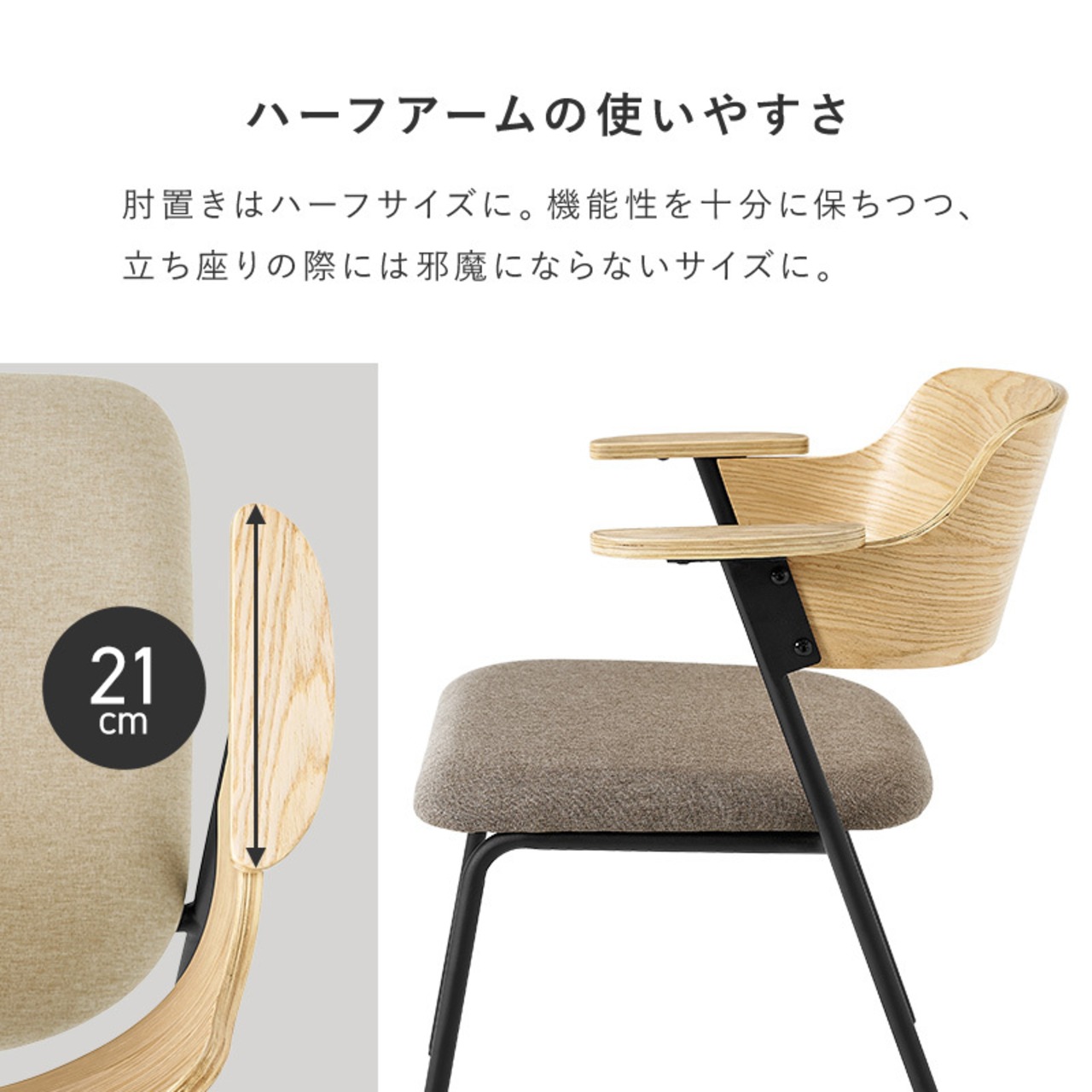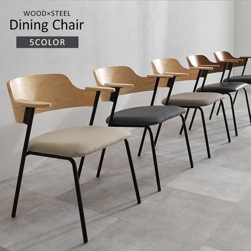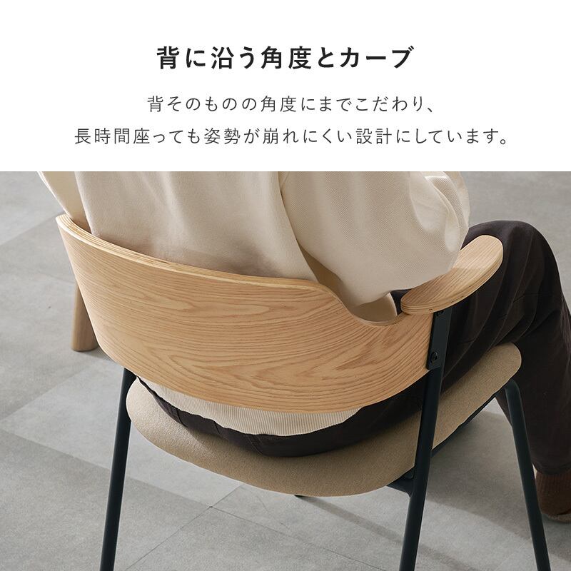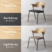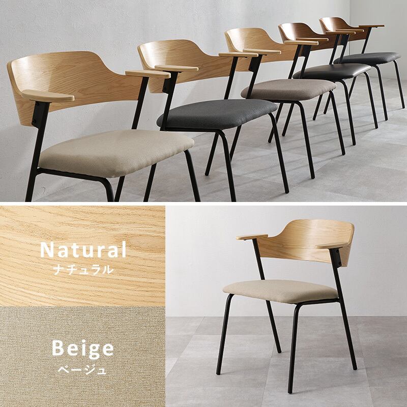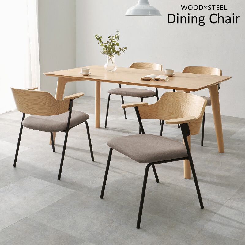 アッシュ材の木目が映える背もたれと細身のスチール、異素材の組み合わせを楽しめるデザインチェア。ハーフサイズの肘置きは邪魔にならないサイズです。同色4脚セット