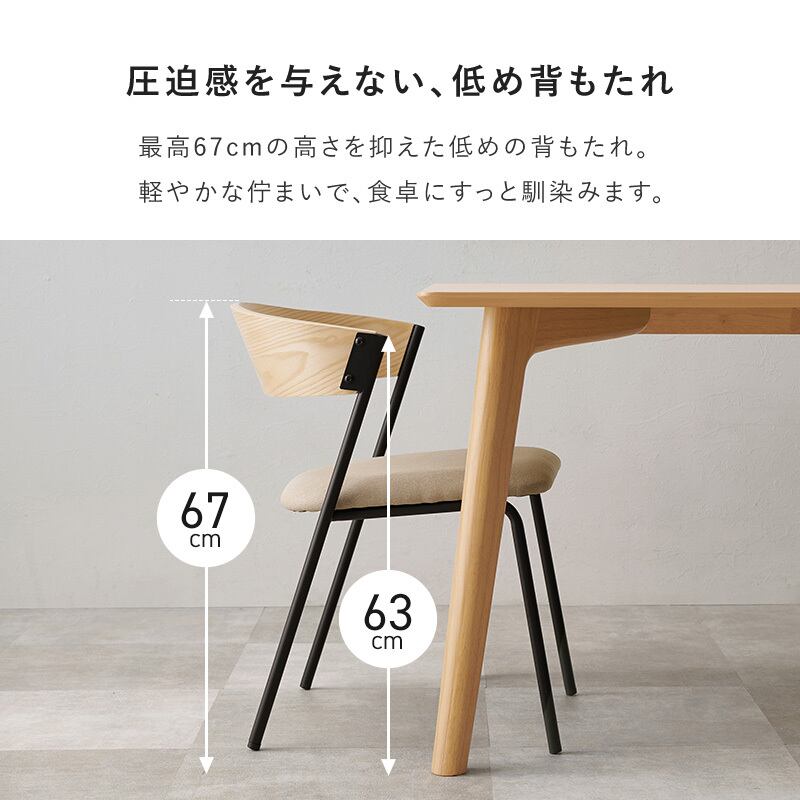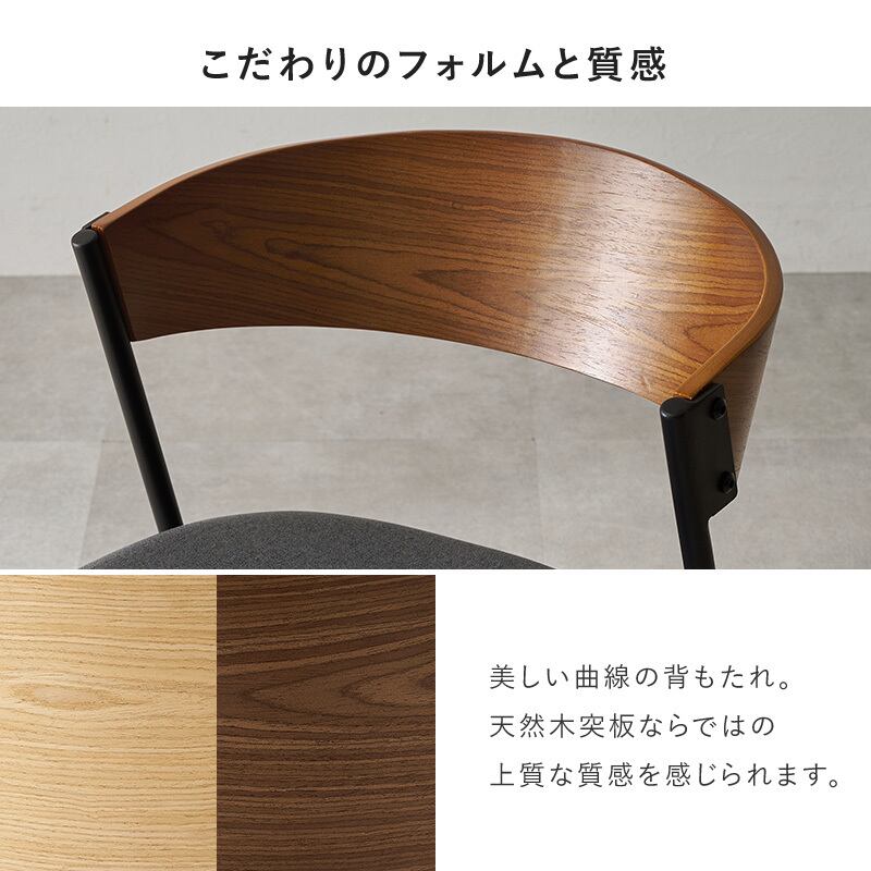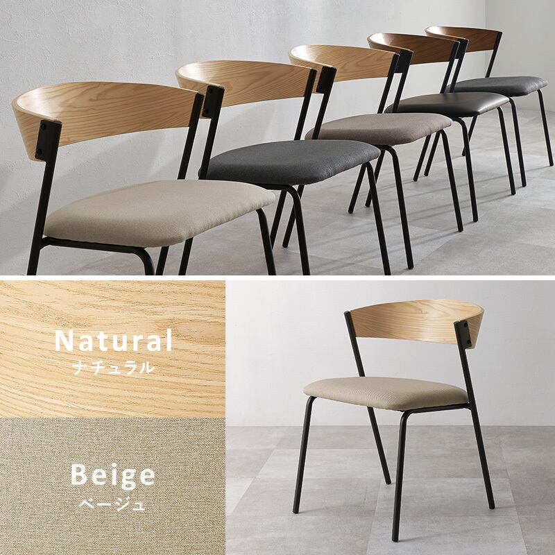 木と鉄と張地の素材の良さが詰まったデザイン。美しい背もたれのカーブは背中に沿う形になっています。同色2脚セット