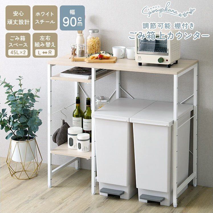 調節可能棚付き ごみ箱上カウンター FKZ-90KC 幅90cm キッチンラック キッチンカウンター 作業台 可動棚 作業スペース 左右組み替え 頑丈設計 PVC