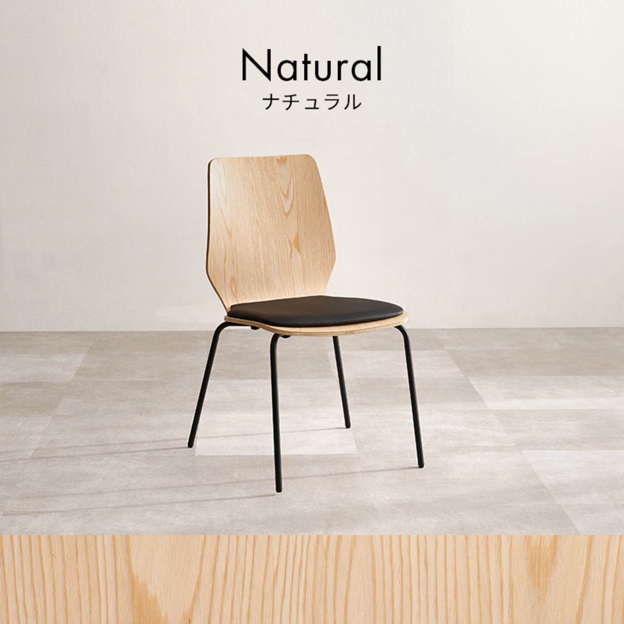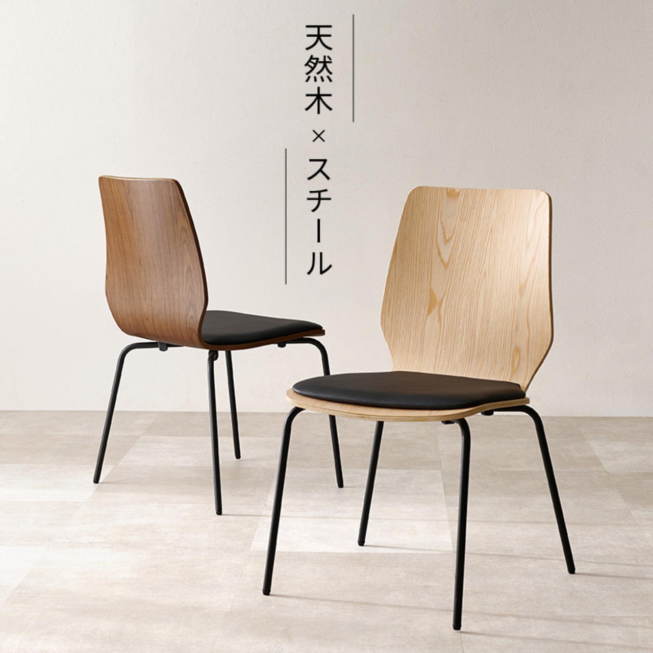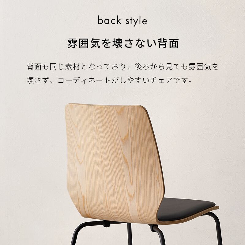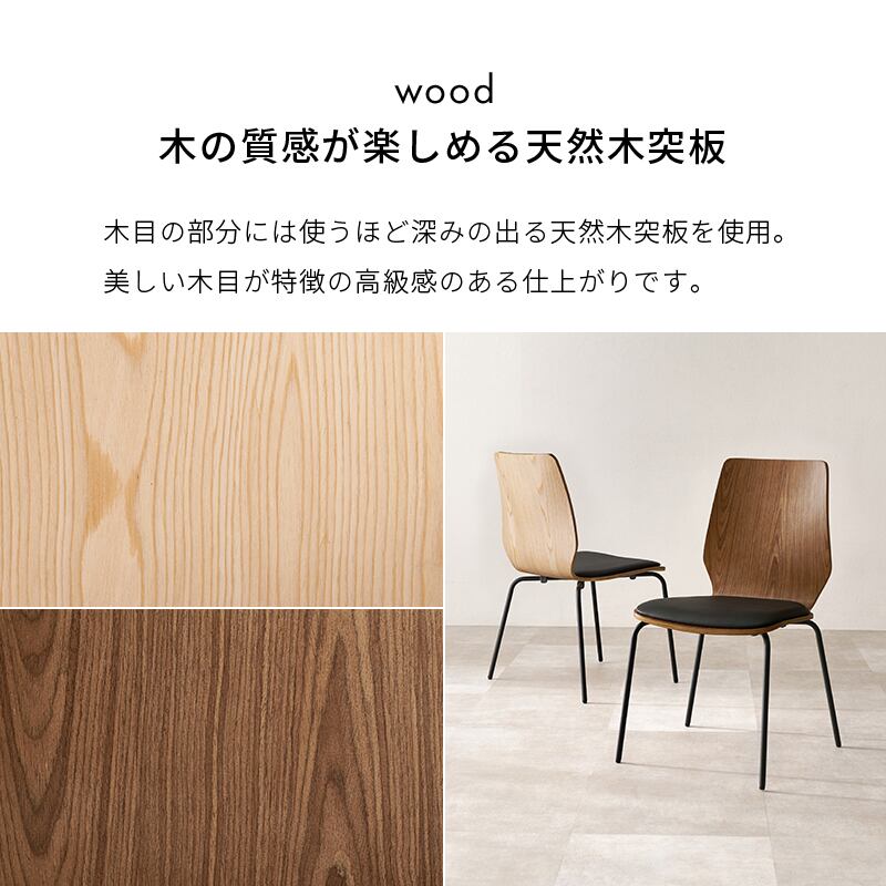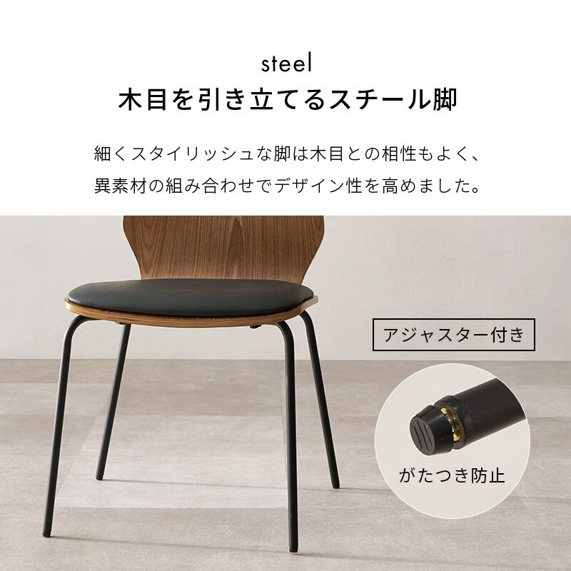 天然木の座面を引き立てるスチール脚がスタイリッシュなデザインチェア。クッション付きで長時間座っても疲れにくい仕様です。スタッキング可能