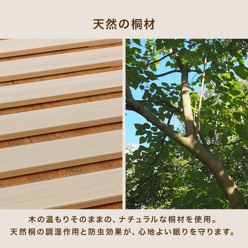 天然木桐材の調湿性とすのこの隙間から空気が通り抜ける構造で布団の湿気がたまりにくくなります。薄型タイプなので床に近い高さで布団のような感覚で使え、使わないときは巻いてコンパクトに収納可能。