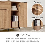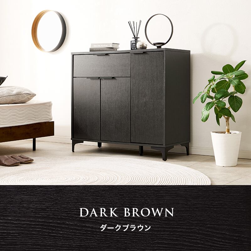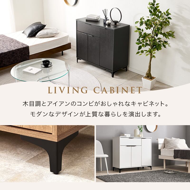 木目調の本体とアイアンの脚部のコンビがおしゃれなキャビネット。よく使うものを取り出しやすい引出しと生活感をスッキリ隠せる扉収納が魅力的。