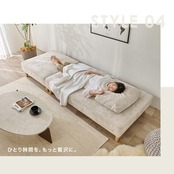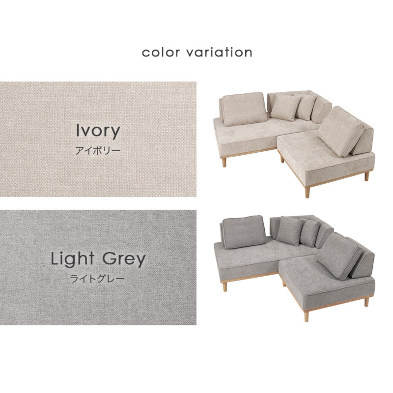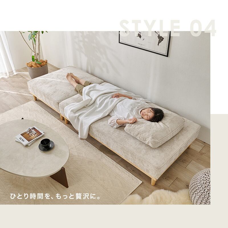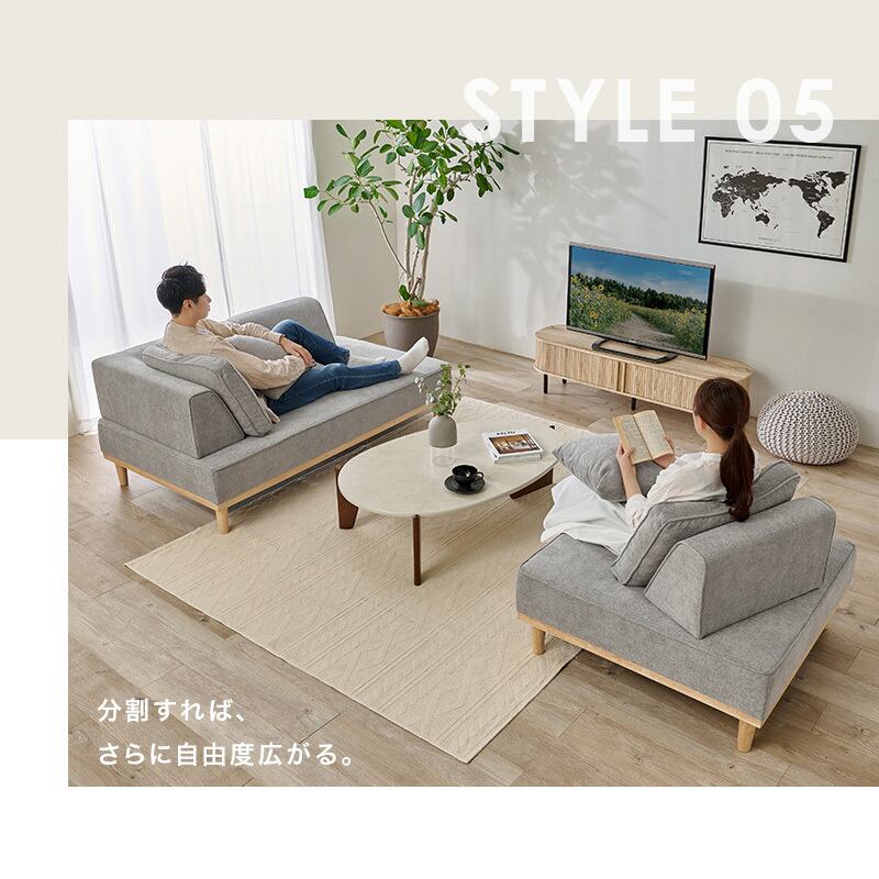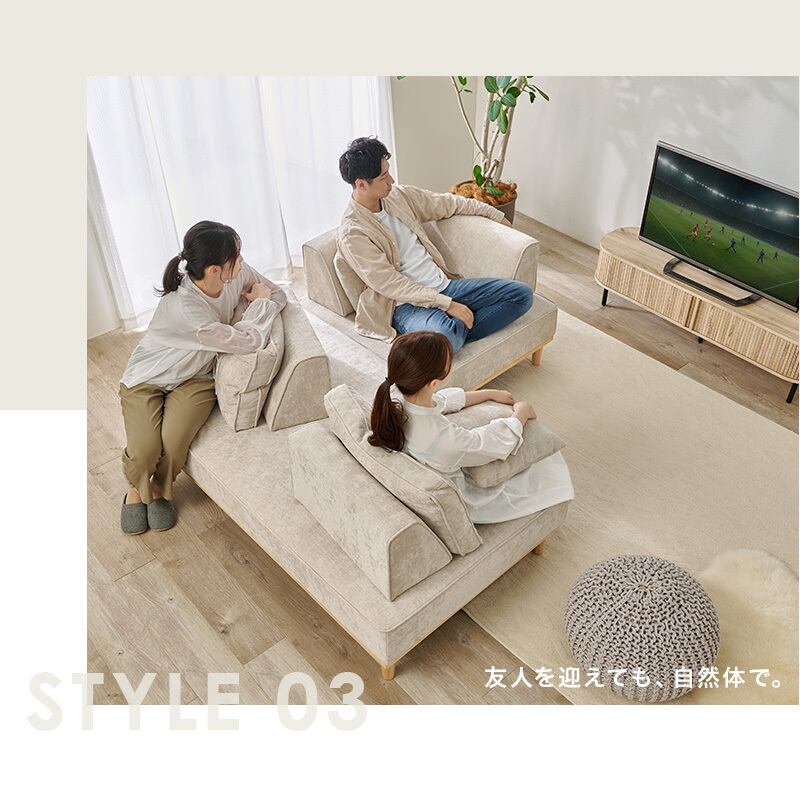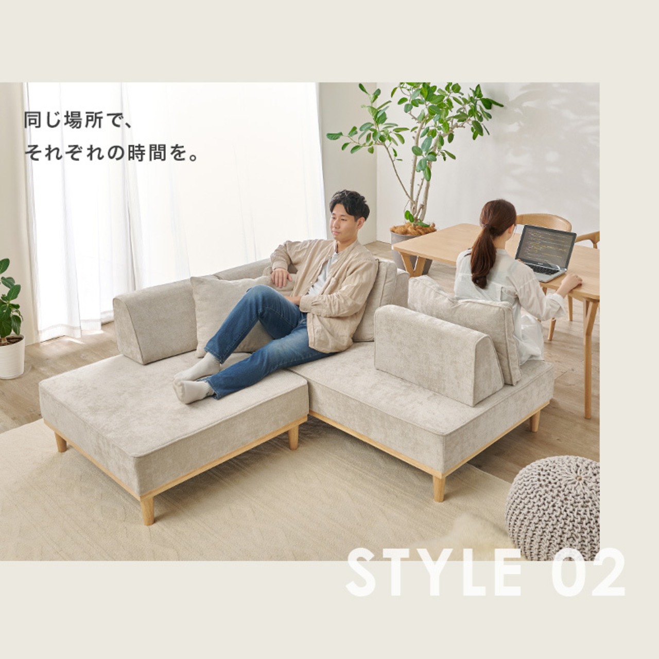 背もたれ、クッションを自由自在に配置できるアイランドソファ。向きを変えて座ったり、寝転んだり、生活スタイルや気分に合わせてくつろぎ方を変更できます。ロー/ハイ兼用