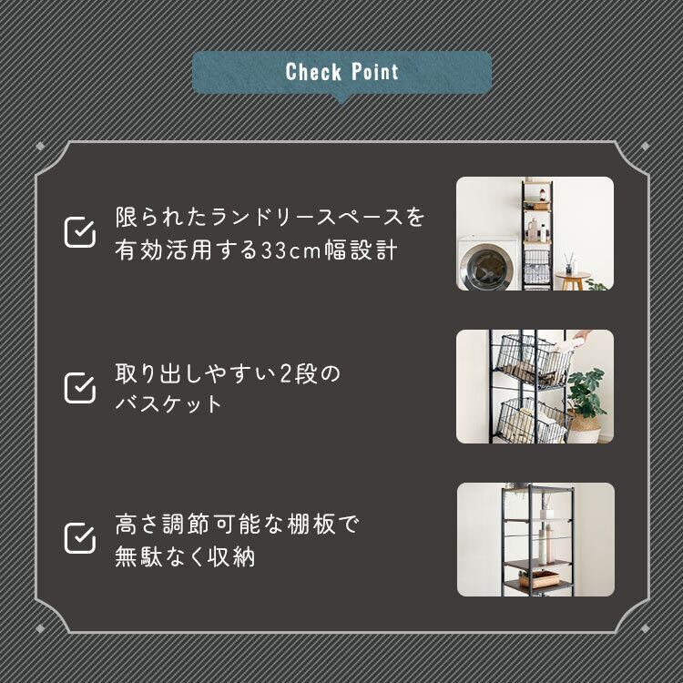 幅約33cmのスリムな設計に洗濯物とランドリー用品をまとめて収納できます!