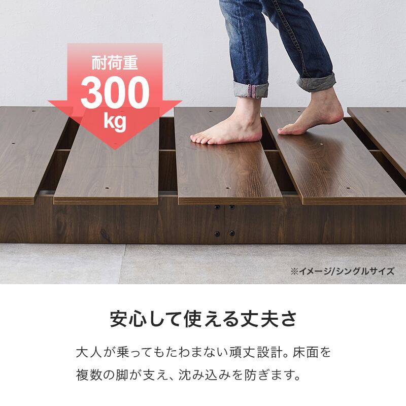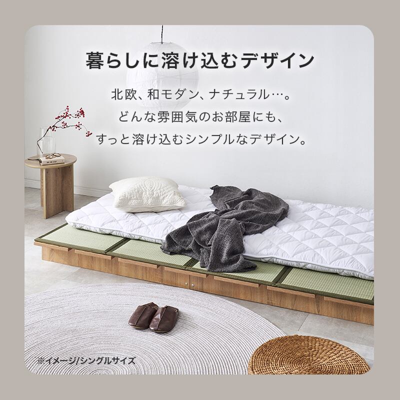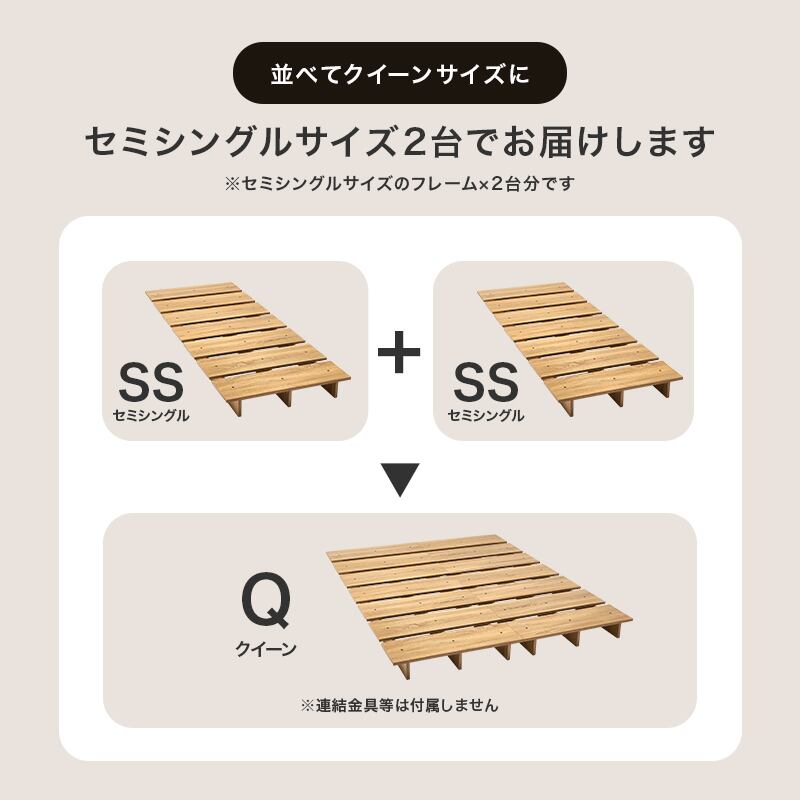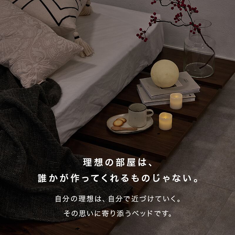 お部屋が広く感じるロースタイル。マットレスのサイズやクッション、置き畳と組み合わせれば、ベッドとしてもくつろぎスペースとしても置き方次第で自分らしい居場所が作れます。セミシングルサイズ2個に分割できるのでL字に並べて使用も可能。