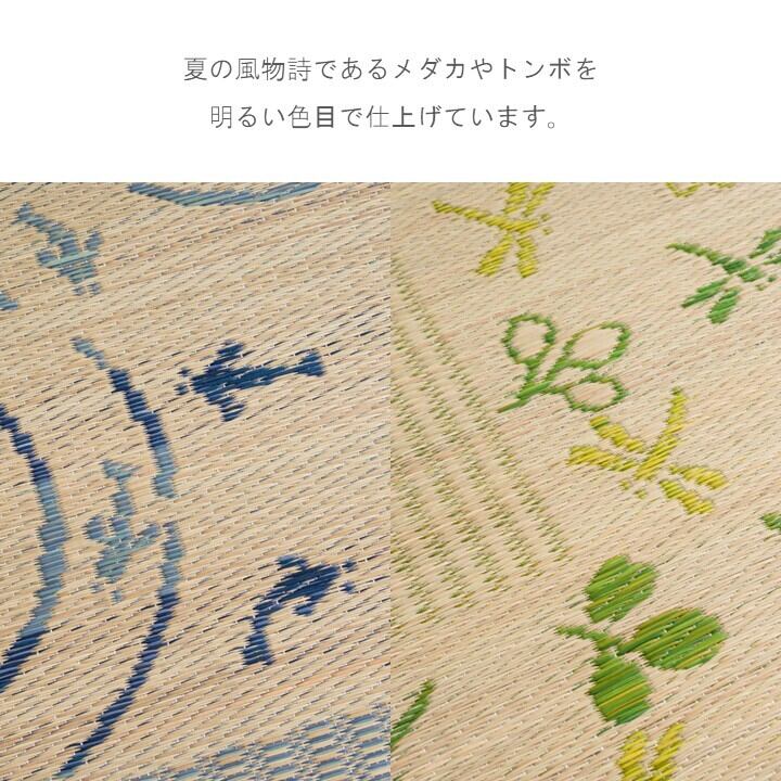夏にぴったりない草ラグです。夏の風物詩であるメダカやトンボを明るい色目で仕上げています。広めの縁取りも明るめの色で仕上げているのでお部屋が明るくなります。