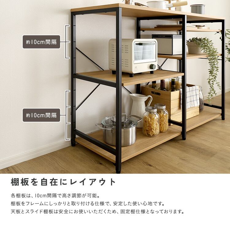 ヴィンテージ調 調節可能キッチンカウンター 幅120cm VKKZ-1240 カウンター キッチン収納 オープンラック スライドトレー付き 頑丈設計 アジャスター付き