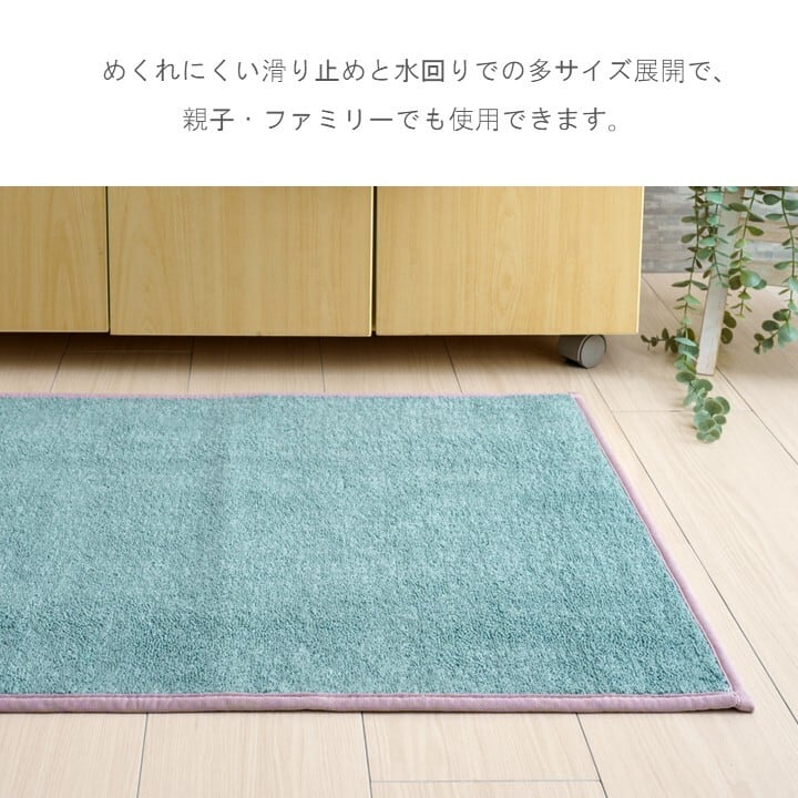 足ざわりの良いポリエステル使用のタオル地素材のバスマットです。めくれにくい滑り止めと水回りでの多サイズ展開で、親子・ファミリーでも使用できます。