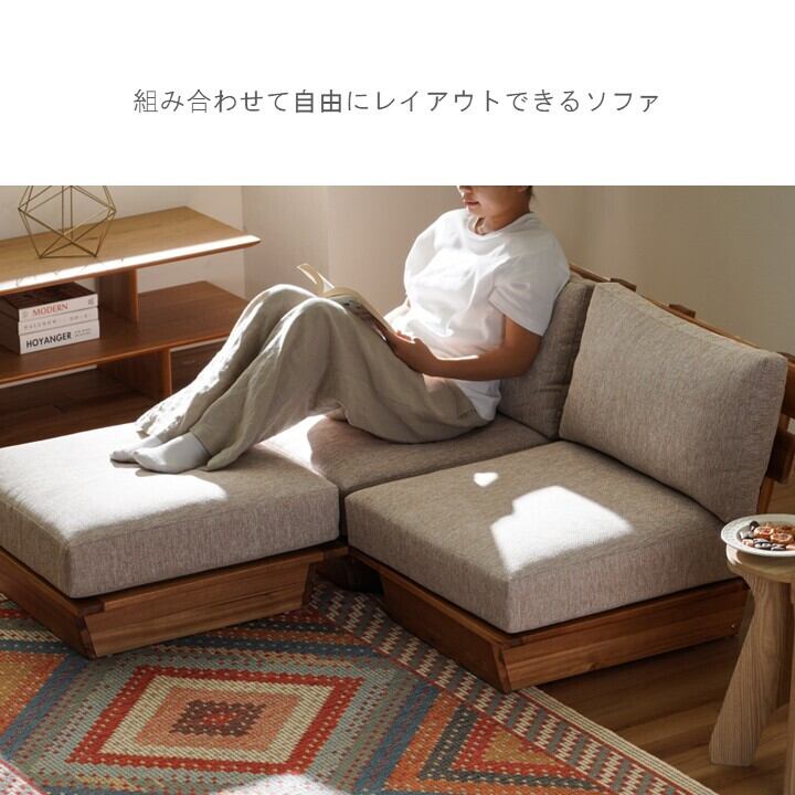 組み合わせて自由にレイアウトできるソファ。アカシア材の自然な温かみが魅力で、座面はズレ防止ストラップ付き。