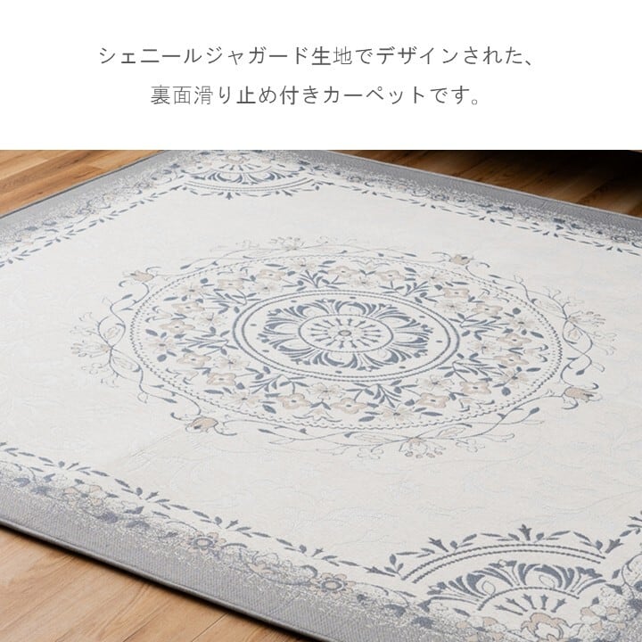シェ二ールジャガード生地でデザインされた、裏面滑り止め付きカーペットです。