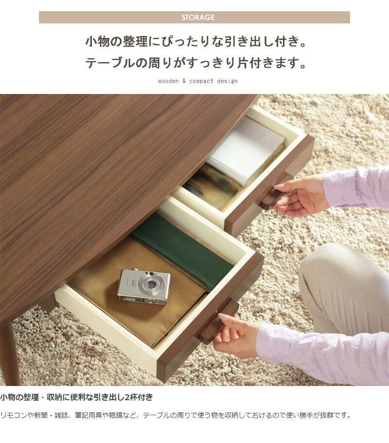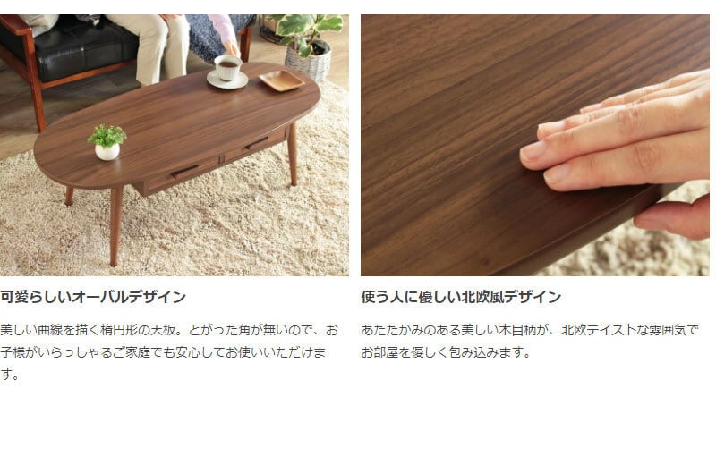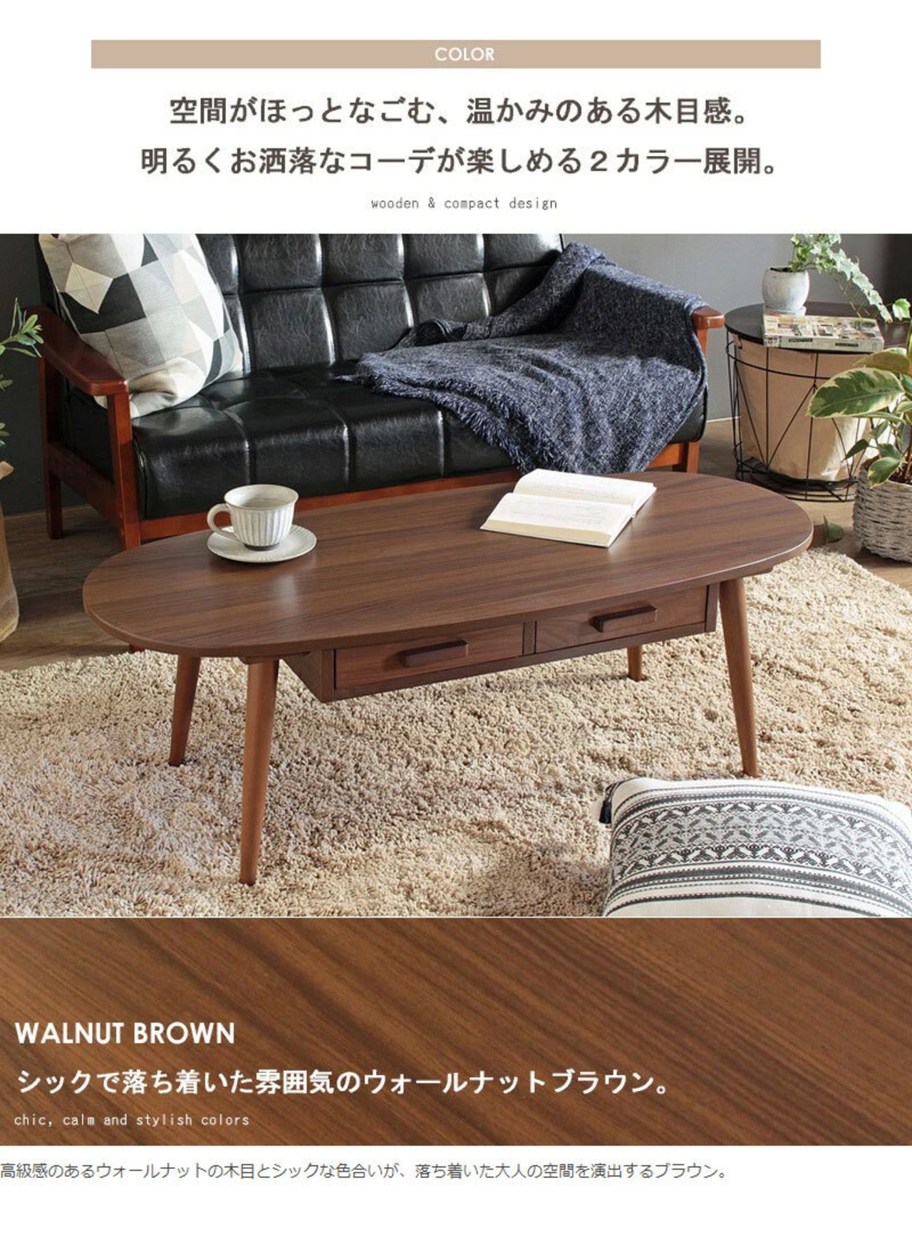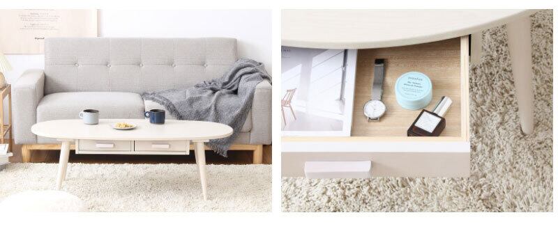 丸くて可愛い卵型の楕円形フォルムに、ぬくもりのある木の質感が空間を優しく包み込む、引き出し付きローテーブル・クライス。