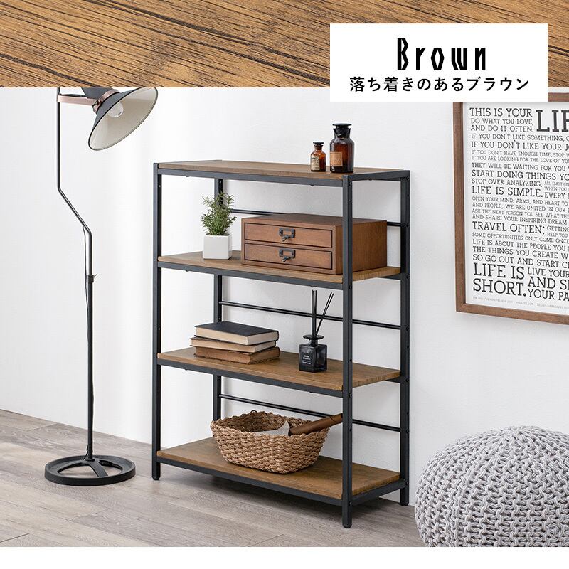 木目調の棚板にアイアンフレームを合わせたシンプルなデザインのオープンラック。4段タイプ
