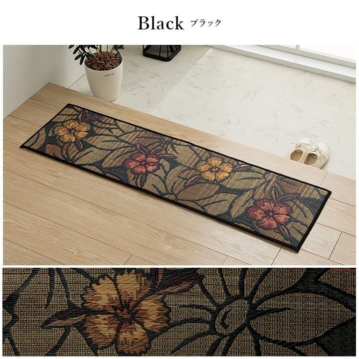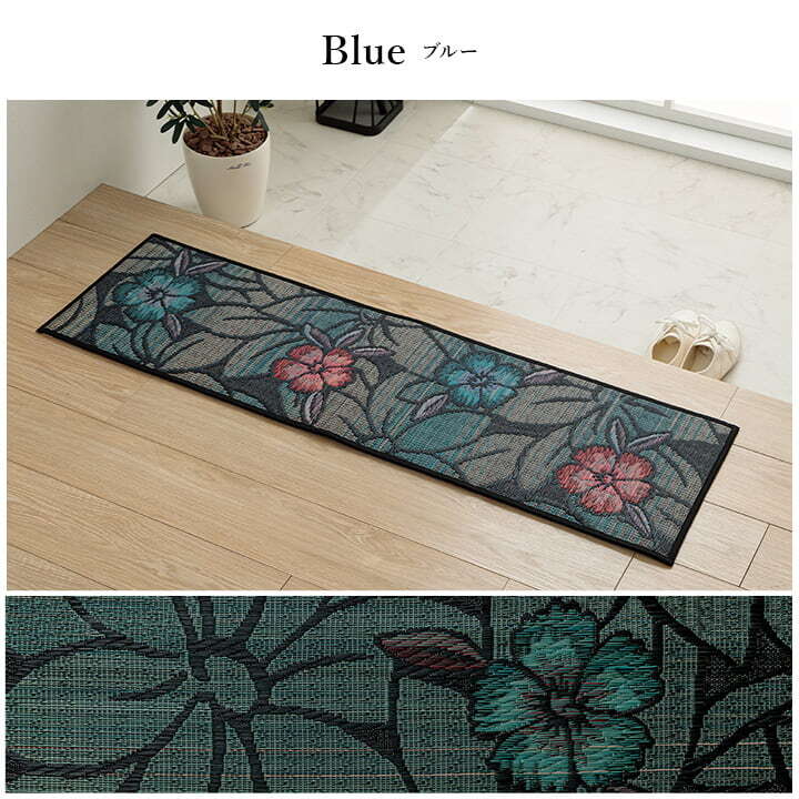 縦糸の本数が多い袋織りという技法で繊細な柄を出しています。折れ曲がりが複雑なので長いイ草を使用しないと切れてしまいます。縦糸が密なので、しっかりとして破れにくいのが特徴です。九州産のい草を使用した上がり框(かまち)です。一本一本が太く、表皮が厚く繊維がキメ細かいので弾力性があり、耐久性に優れています。い草には空気の自然浄化作用、湿度の調節作用などがあります。また汚れにくく、使用するうちに黄金色に変化し味が出ます。い草にヒバエッセンス加工を施しています。(抗菌防臭効果)裏にはウレタンを貼っていますので適度なクッション性があります。