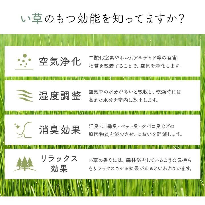 九州産のい草を使用した玄関マットです。一本一本が太く、表皮が厚く繊維がキメ細かいので弾力性があり、耐久性に優れています。い草には空気の清浄化作用、湿度の調節作用があり、汚れにくいといった特徴があります。青森県のヒバの木から抽出した「ヒバエッセンス」をメーカー独自の技術で生地表面に加工しました。 ヒバエッセンスにはヒノキチオールという天然物質が含まれており、抗菌防臭効果があります。裏には適度なクッション性があり、滑りにくい国産のウレタンを貼っています。