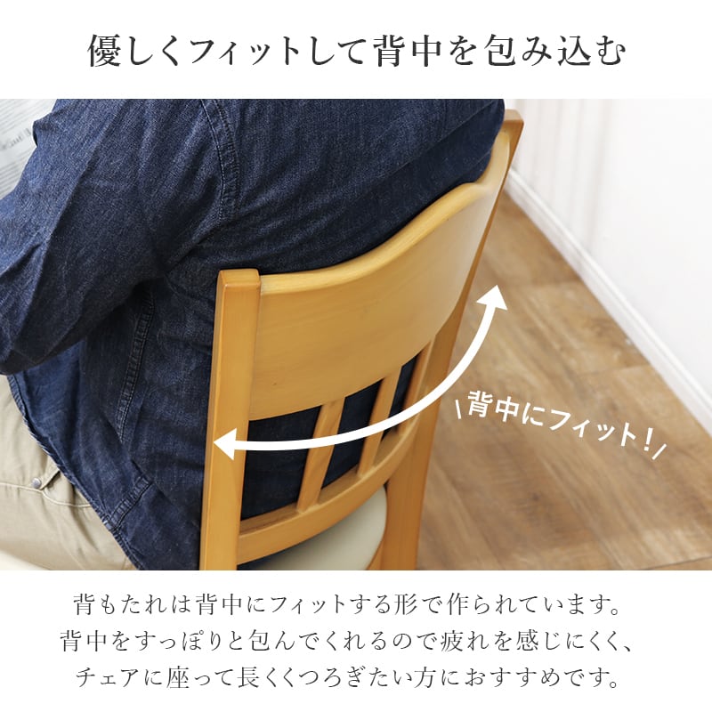 届いた日からすぐに使える完成品でお届け。座面にクッションが付いているのでお尻に負担がかかりにくく、背もたれのデザインが特徴です。