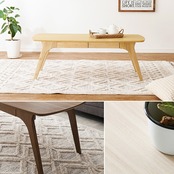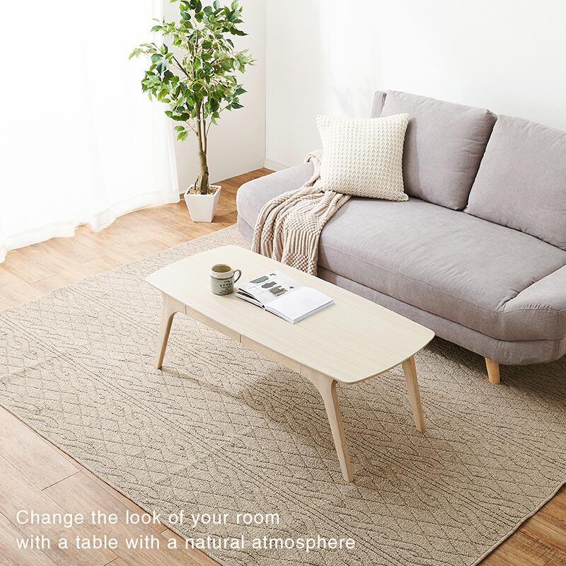 なめらかな曲線とスタイリッシュなシルエットにこだわった木目調のセンターテーブル。幅広で作業もしやすく、便利な引出し収納付き。